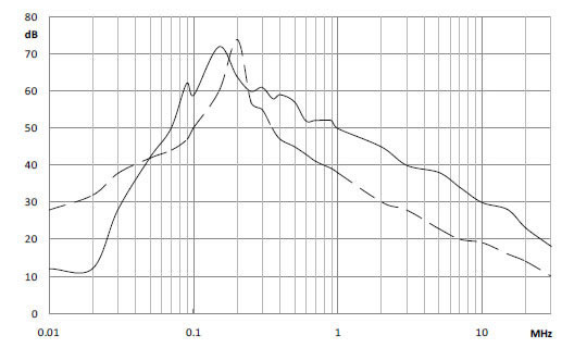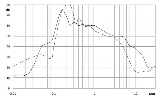 | EMIフィルタアプリケーションによるノイズの減衰係数 | 3981-fold | 891-fold | 199-fold | 50-fold | 11-fold | 2.5-fold |